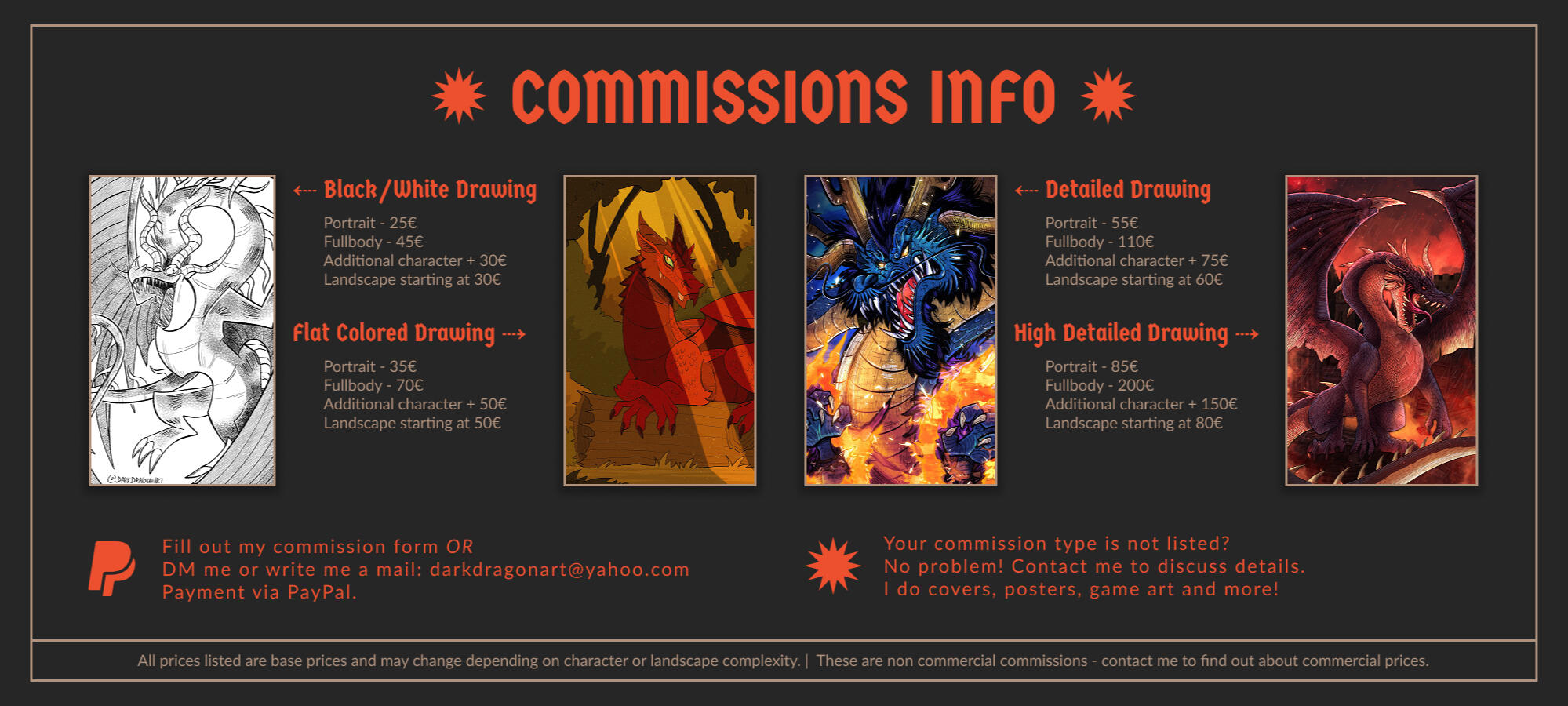 The following is my Terms of Service (TOS). This works as a form of contract between you (the customer) and me (the artist). Here I'll describe what I provide in exchange of payment and how my workflow works. (The complete site counts as tos, including the rules and the workflow).1) When commissioning me, you agree to my TOS. Failure to do so will result in a decline of your commission.2) Payment works via PayPal (EUR). Full payment is required before I start working on your commission. Never pay me, before I have accepted your commission. I'll always write an invoice as part of our contract. (Payment should be paid within a week/ 7 days).If Euro (€) is not your main currency, you need to check the price out on your own, via currency calculator for example.3) Extra fees outside of the example prices will be charged depending on the complexity of your character and added extras. For examples objects like weapons, environment extras etc. These prices are decided on a case - by - case scenario.4) I reserve the right to decline a commission for any reason.5) After the artwork is completed customers are not entitled to any refund.6) You can feel free to tip me, but this is not an obligation! An option is given via my invoice for customers.7) The final product of a commission includes the original artwork file in a png./ jpeg. - form and is send to you via email or wetransfer.8) Licensed work can include original file data like psd. files. Vector files for logos include and extra license fee.9) If you commissioned an image from me, you automatically gain personal rights for it. This doesn't mean that you can use your commission for a reselling purpose, using it for merch, promo work, etc. It is possible to buy the full rights to your image.10) Private Commissions are possible to purchase from me. In this case I won't upload it on my social media platforms and galleries. An extra fee of 20% of the regular price will be added.11) If you need your commission to a special date, please let me know via the commission form. I'll check if I can match the deadline with your wishes then.