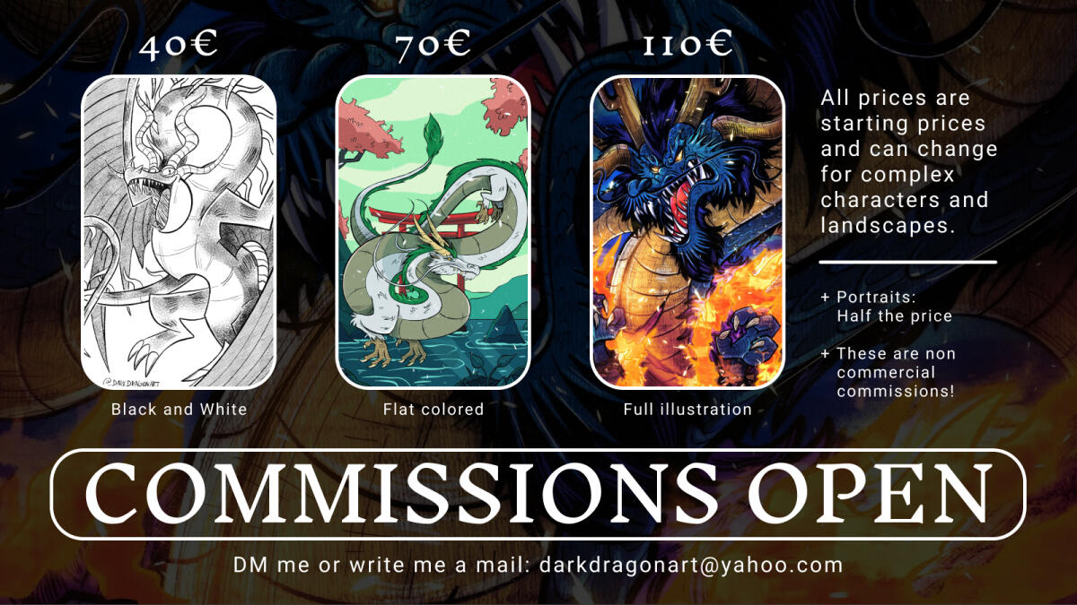 Here you can find some image examples and their prices. If you are interested in something which isn't listen, just write me an email and we can discuss about your commission.😃